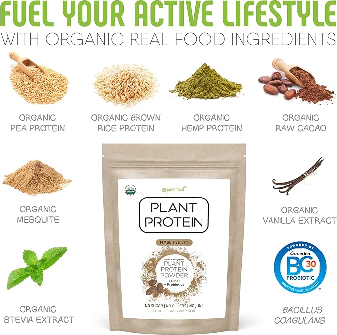 - THE BEST PLANT-BASED PROTEIN POWDER FOR CLEAN EATERS. Pure Food is THE ONLY plant protein powder with 100% organic, real food ingredients AND probiotics. It's free of added sugar, gluten, dairy, soy, corn, GMOs, and additives like so-called "natural" flavors. Fuel your cells with clean, pure REAL FOOD ingredients instead of the preservatives, chemicals, and fillers 99% of other powders contain. Discover why Pure Food is the cleanest, greenest vegan/vegetarian protein powder ever created.