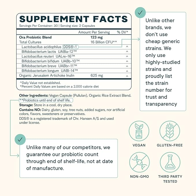 Ora Organic Probiotics with Prebiotics for Digestive Health 16 Billion CFU - Trust Your Gut - Strains - Acidophilus Lactobacillus Breve Bifidum Lactis