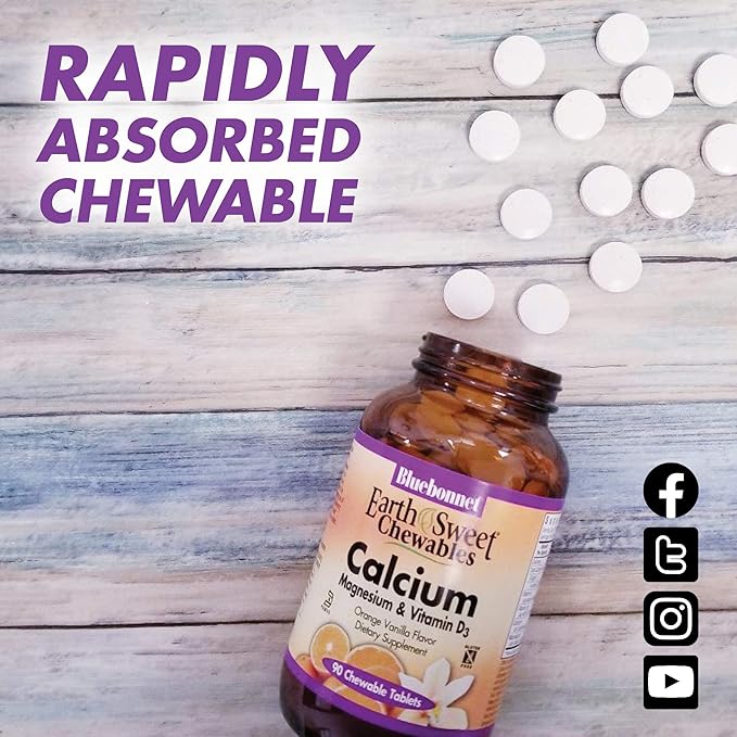Bluebonnet Nutrition Calcium Magnesium Plus Vitamin D3 Earthsweet, Bone Health & Muscle Relaxation, Soy-Free, Gluten-Free, Kosher, Dairy-Free,90 Orange Vanilla Flavored Chewable Tablets