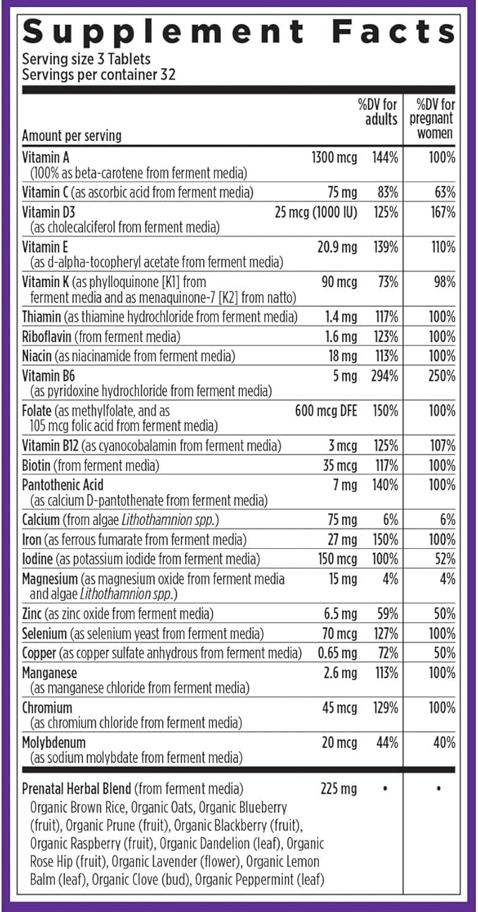 - 3 NUTRIENT-PACKED TABLETS support baby’s healthy development and mom’s healthy pregnancy.*100% Daily Value of Iron, and rich in Folate, B Vitamins, Vitamin D3, Vitamin C, A and Zinc.