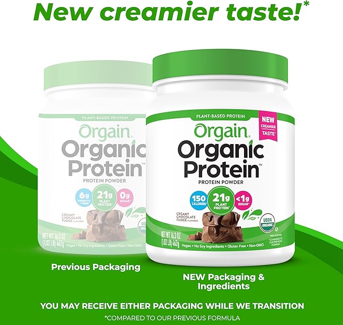 Orgain Organic Vegan Protein Powder, Creamy Chocolate Fudge - 21g Plant Protein, 7g Prebiotic Fiber, No Lactose Ingredients, No Added Sugar, Non-GMO, Shakes & Smoothies, 1.02 lb (Packaging May Vary)