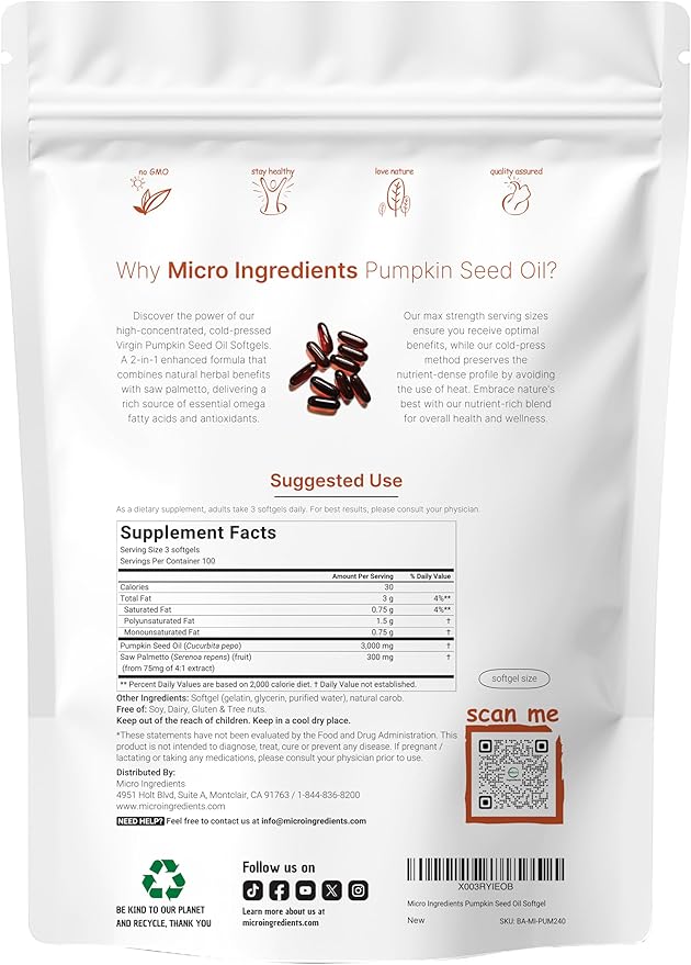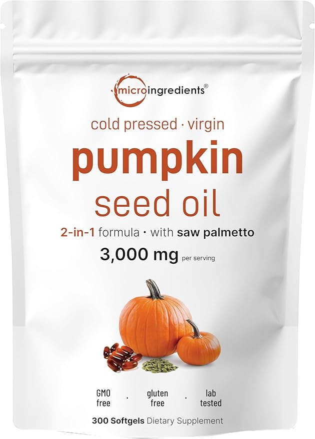 - Micro Ingredients offers max strength virgin pumpkin seed oil softgels, high concentrated cold-pressed ingredients, 2-in-1 complex with saw palmetto extract, retains essential fatty acids, phytosterols, and antioxidants.