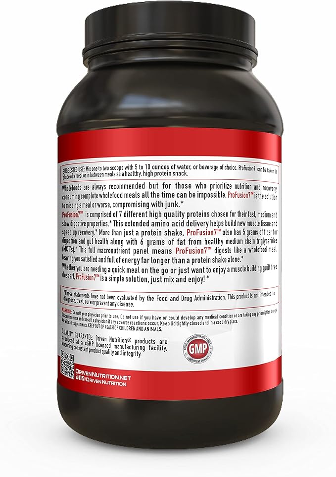 - MEAL ON-THE-GO: Navigating a busy schedule and maintaining a balanced diet can be difficult. It's all too easy to grab a sugar-filled snack from the store that totally derails your diet plans. Thanks to Driven Nutrition’s Pro Fusion 7, you never have to carry that concern. Toss 1 to 2 scoops into cold water or milk and blend. Enjoy a delicious shake that's high in protein and low in sugar.
