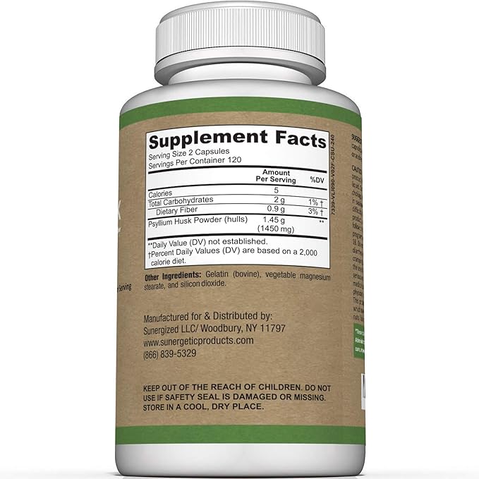 - GMP CERTIFIED FACILITY: Sunergetic's Psyllium Husk formula is manufactured in an FDA registered facility that adheres to Good Manufacturing Practices (GMP). Sunergetic is committed to maintaining high quality Psyllium Husk fiber capsules.