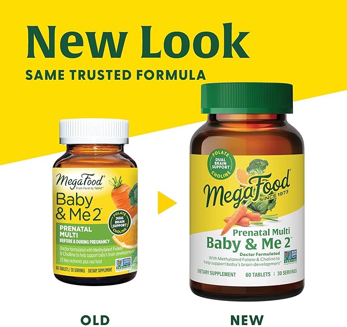 MegaFood Baby & Me 2 Prenatal Vitamin and Minerals - Vitamins for Women - with Folate (Folic Acid Natural Form), Choline, Iron, Iodine, and Vitamin C, Vitamin D and more - 120 Tabs (60 Servings)