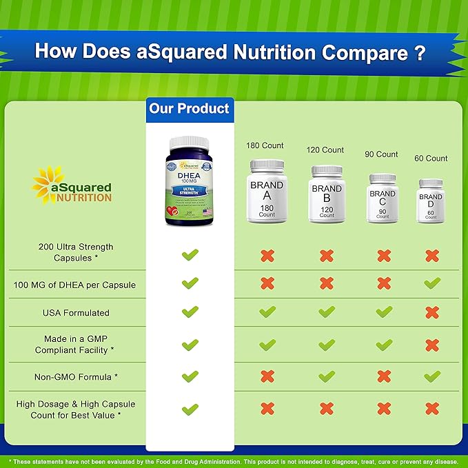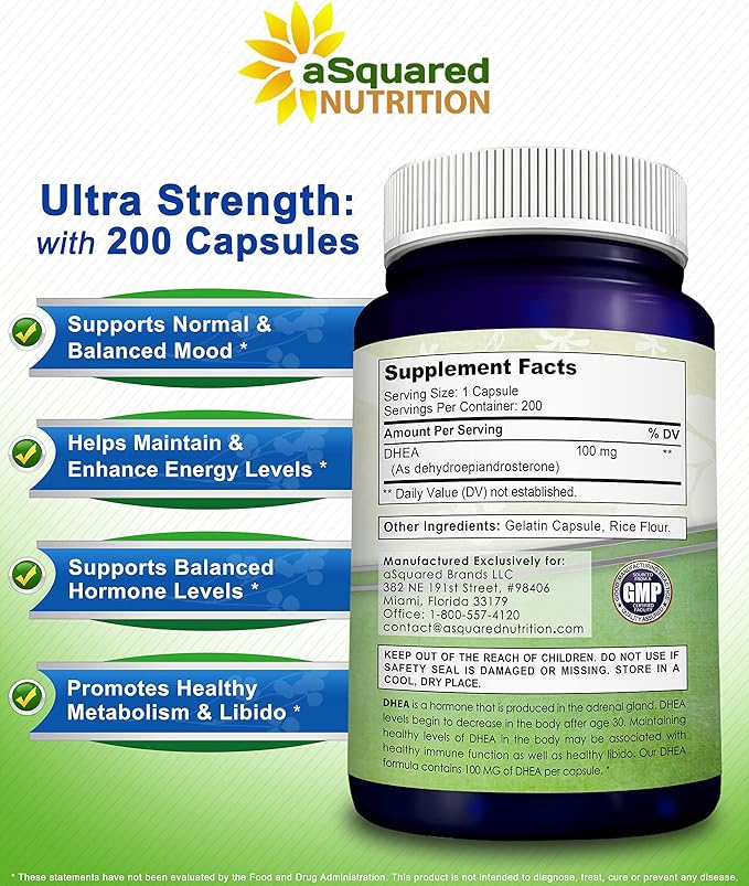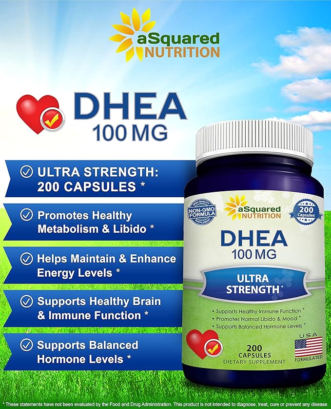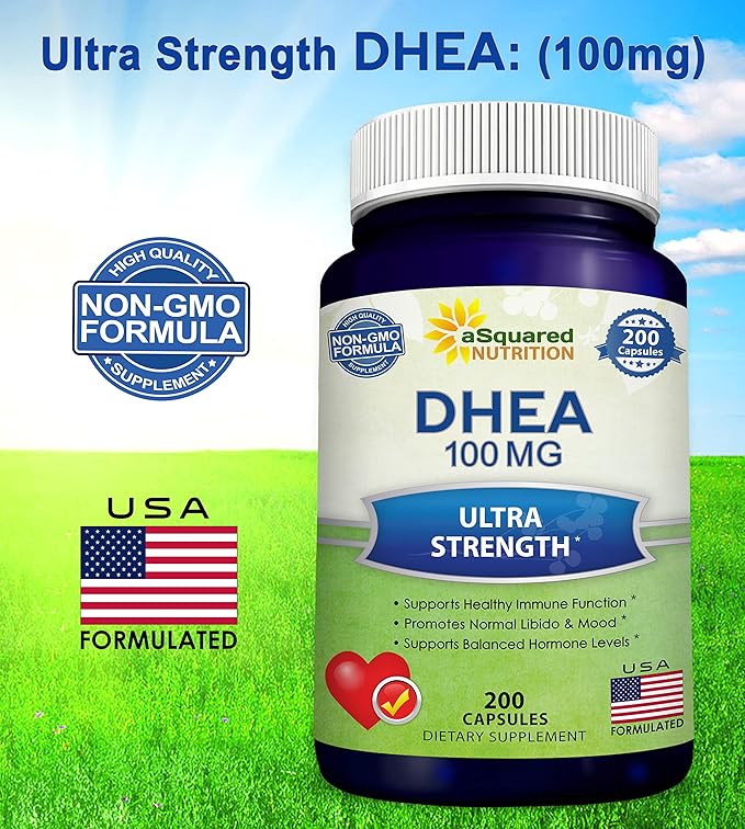 - MAXIMUM STRENGTH DHEA (100 MG PER CAPSULE): DHEA (dehydroepiandrosterone) is a natural hormone that is produced by the adrenal glands. DHEA levels peak in your late 20s to early 30s. At that point, DHEA levels begin to dramatically decrease. aSquared Nutrition’s Max Strength DHEA formula provides 200 capsules of 100mg DHEA per bottle, which can help restore peak DHEA levels by taking as little as 1 capsule per day. Our product is made in the USA.