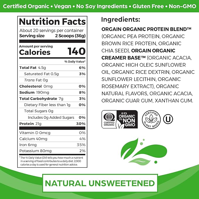 Orgain Organic Vegan Protein Powder, Natural Unsweetened - 21g of Plant Protein, 4g Prebiotic Fiber, Low Net Carbs, No Lactose Ingredients, No Added Sugar, Non-GMO, For Shakes & Smoothies, 1.59 lb