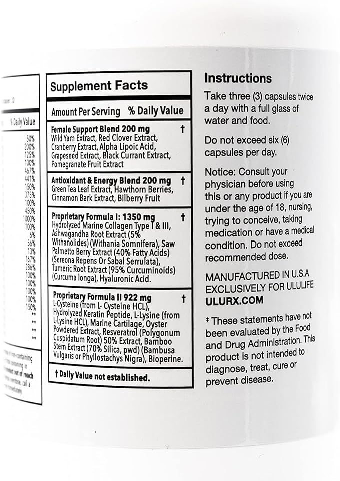 - Special Ingredients : Biotin B7 Hydrolyzed Marine Collagen Type I & III Hydrolyzed Keratin Peptide Saw Palmetto Berry Extract Resveratrol Ashwagandha Root Extract Turmeric Root Extract Hyaluronic Acid Vitamin C Vitamin D3 Vitamin E Thiamin Riboflavin Niacin Vitamin B6 Folate Vitamin B12 Biotin B7 Pantothenic Acid Calcium Iron iodine Magnesium Zinc Selenium Copper Manganese Chromium Molybdenum Wild Yam Extract Red Clover Extract Cranberry Extract Alpha Lipoic Acid Grape Seed Extract Black Currant Fruit Extract Pomegranate Fruit Extract Green Tea Leaf Extract Hawthorn Berries Cinnamon Bark Extract Bilberry Fruit L-Cysteine, Oyster Powdered Extract, Resveratrol 50% extract, Bamboo Stem Extract Bioperine. Other Ingredients: Gelatin capsule. Biotin B7 Hydrolyzed Marine Collagen Type I & III Hydrolyzed Keratin Peptide Saw Palmetto Berry Extract Resveratrol Ashwagandha Root Extract Tur… See more