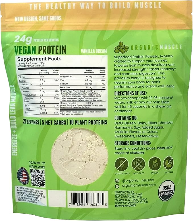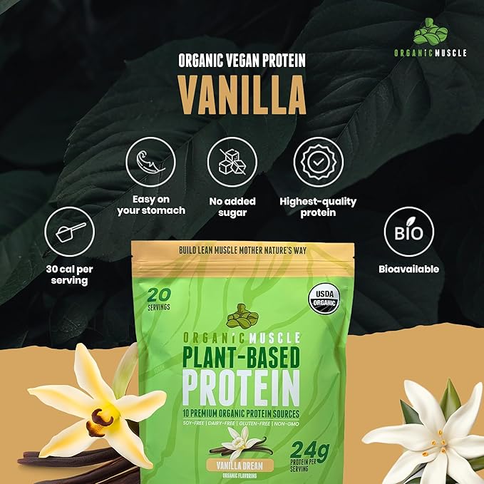 Organic Muscle Organic Vegan Protein Powder - Plant Based Vanilla Protein Powder with Pea, Hemp, Brown Rice, Chia Seed & Amino Acids - Low Calorie for Muscle Growth & Speed Recovery