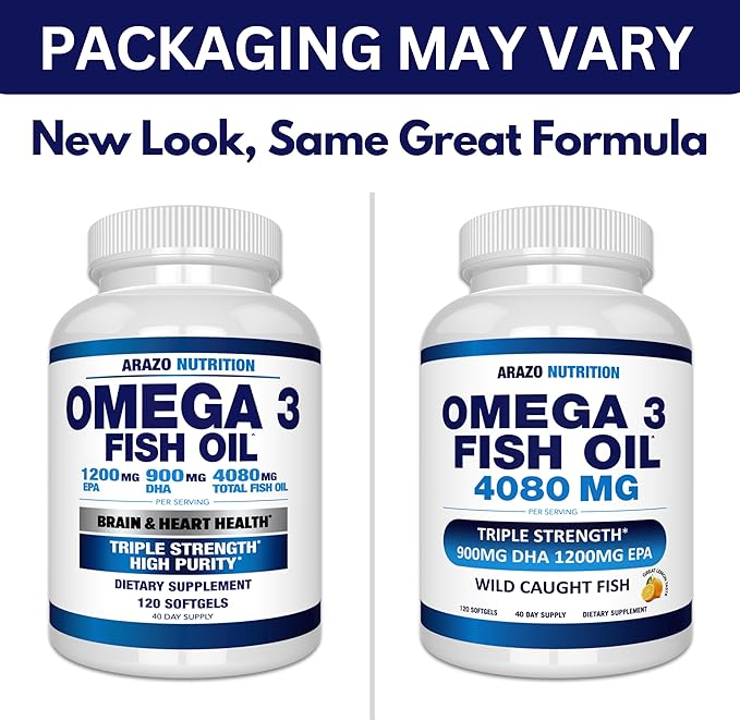 Arazo Nutrition Wild Caught Omega 3 Fish Oil – 120 Soft Gels – 4,080mg High EPA 1200mg DHA 900mg Lemon Flavor Burpless Softgels