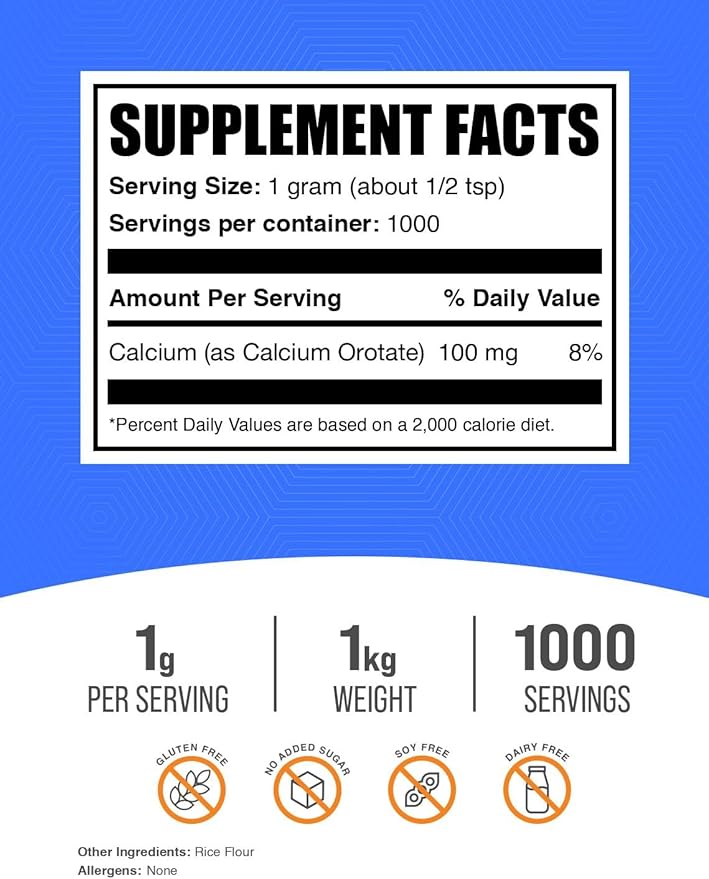 - Designed for Optimal Health: Elevate your daily wellness routine with our Calcium Orotate powder, in Calcium Orotate 1000mg. These are not just supplements; Calcium Orotate supplement is a daily investment in your wellbeing, meticulously formulated to ensure your body receives the perfect balance of essential minerals for optimal health.