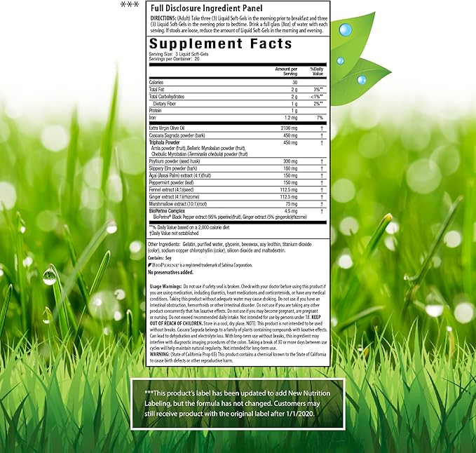 - ADVANCED DELIVERY SYSTEM - Delivers a powerful combination of natural ingredients like triphala, psyllium, slippery elm, acai and peppermint. These easy-to-swallow liquid soft-gels provide an optimum delivery system to release these nutrients fast without any added preservatives, binders or fillers.