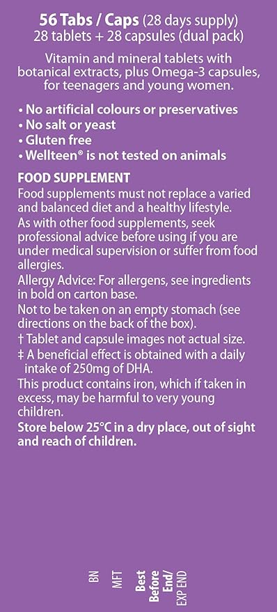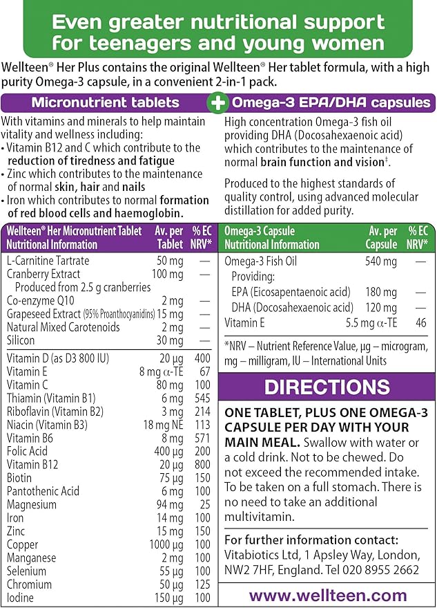 - ADVANCED NUTRITIONAL SUPPORT: Wellteen Her Plus has been developed especially for teenagers and young women aged 13-19 years. It provides the original Wellteen Her comprehensive range of vitamins, minerals, Co-Q10, L-Carnitine, Grapeseed and Cranberry botanical extracts plus a high purity Omega-3 capsule.