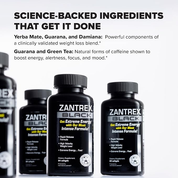 - ENDLESS ENERGY - With a potent xanthine mixture, Zantrex Black will give you extreme, powerful energy to get you through the day. Tackle the demands of the day with ease and stability with our fast weight loss pills that actually work!