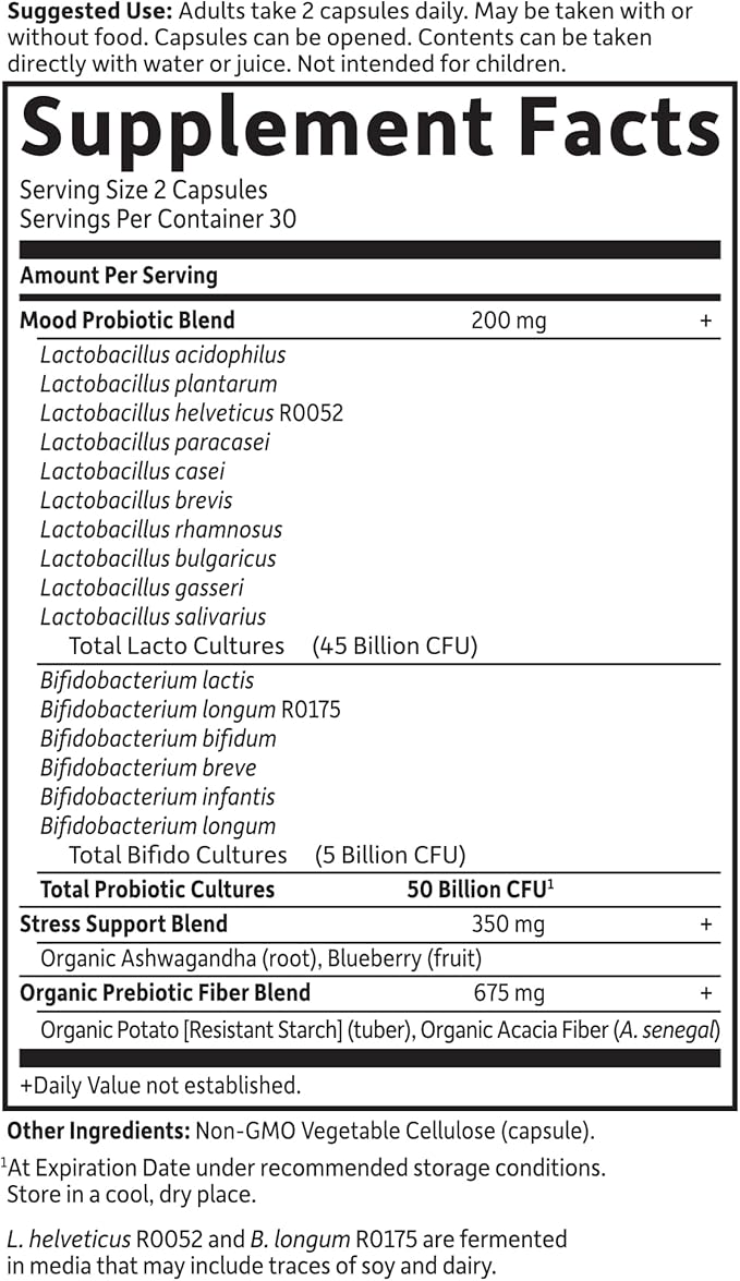 - DIGESTION SUPPORT: Emerging science shows a link between gut & brain health; this supplement includes L. helveticus ROO52 & B. longum RO175—Clinically shown to support mood and relaxation—plus Lactobacillus acidophilus probiotics for digestive health