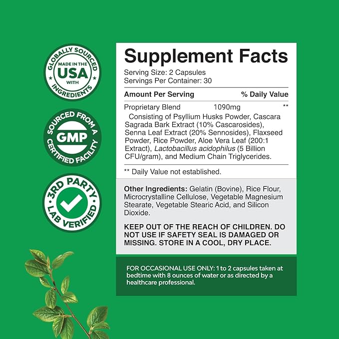 Herbal Laxative Capsules with Probiotics – Natural Laxative Pills to Cleanse Colon and Support Digestive System with Psyllium Husk Powder Senna Leaf Cascara Sagrada – Gentle Laxative for Women & Men