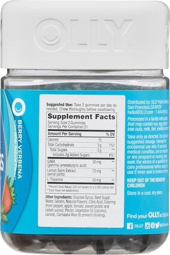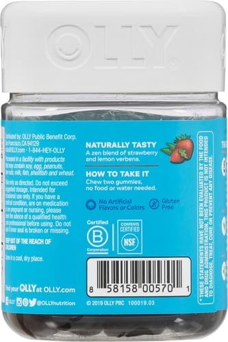 - OLLY GOODBYE STRESS GUMMY: Calm your mind and counter bad vibes with the help of our strawberry and lemon verbena flavored gummy supplements. This stress support zen blend uses GABA and L-Theanine to help you stay calm, cool, and collected.