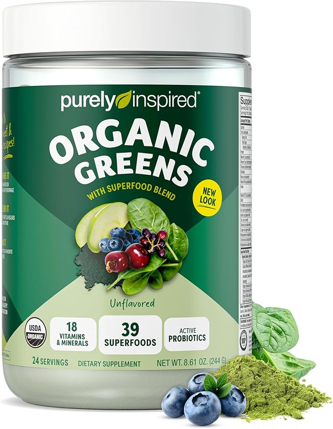 - 39 Superfoods in Every Serving: Each scoop of Purely Inspired Organic Greens packs a nutrient-rich punch with 39 superfoods, 18 vitamins and minerals (including antioxidants C and E), and 110 million CFU probiotics. Unflavored. 24 servings per container.