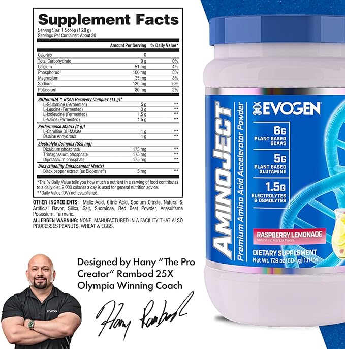 - DESIGNED BY THE PRO CREATOR – Developed by Hany Rambod, 25X Olympia-winning coach, Evogen AminoJect is a science-backed recovery catalyst built for muscle hydration, recovery, and growth. Pair with an Evogen pre workout supplement for even better results.