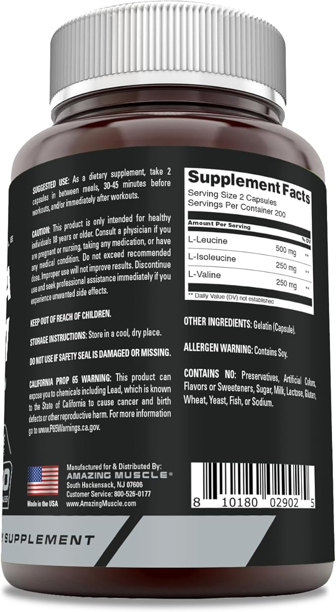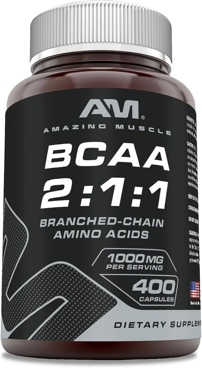 Amazing Muscle BCAA 2:1:1 1000 Mg | Pre-Workout Supplement | 400 Capsules | Non-GMO | Gluten-Free | Made in USA