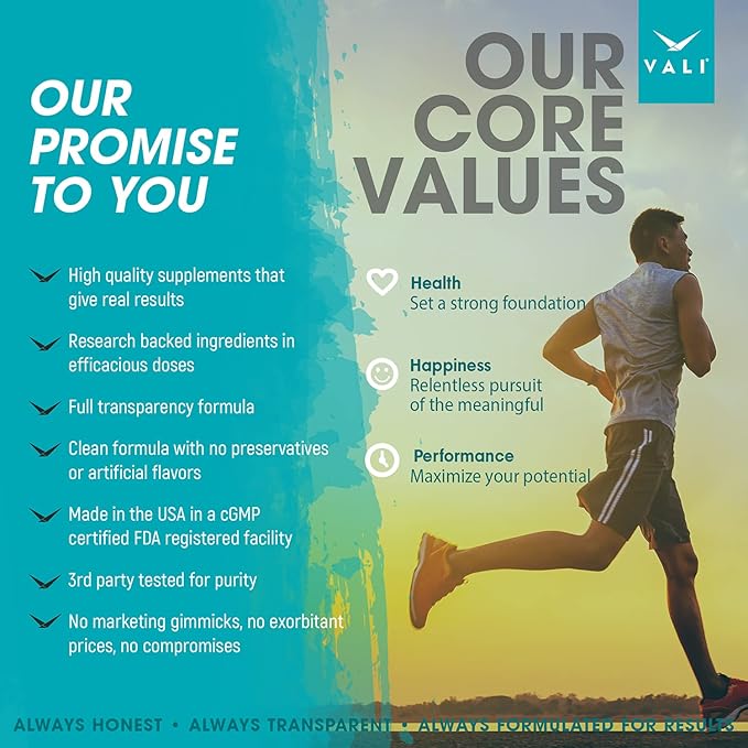 - Health, Happiness, & Performance - We started VALI because we want to know exactly what’s inside our supplements and we want supplements that give real results without the marketing fluff other companies use to charge exorbitant prices. Nothing proprietary, clean highest quality ingredients at a great value, transparent formula, 3rd party testing for purity, and a commitment to above and beyond customer service. This is our promise to you!