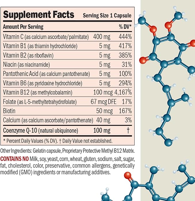 - SUPERIOR PURE BIO-ACTIVE INGREDIENTS – Provides the finest, natural source of CoQ10, world’s most sophisticated high potency B-complex formula, including our absorption-protected Natural B12, vitamin C and Calcium. Contains NO Milk / Dairy-Free, Gluten Free; NO soy, yeast, corn, wheat, sodium, salt, sugar, fat, color, preservative, common allergens or manufacturing additives.