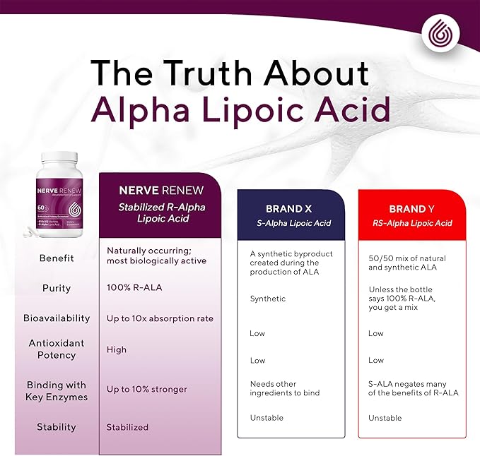 - 10% Stronger R-Alpha-Lipoic Acid: Our R alpha lipoic acid 300mg capsules are powered by the most stabilized naturally occurring form of this standout nerve antioxidant. Thus, more easily absorbed and utilized R ALA by the body than most forms found in other nerve health supplements. We optimized Nerve Renew for maximum results because our nerves deserve the best.