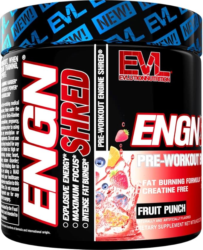 EVL Ultimate Pre Workout Powder - Thermogenic Fat Burn Support Preworkout Powder Drink for Lasting Energy Focus and Stamina - ENGN Shred Intense Creatine Free Preworkout Drink Mix - Fruit Punch