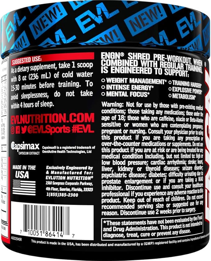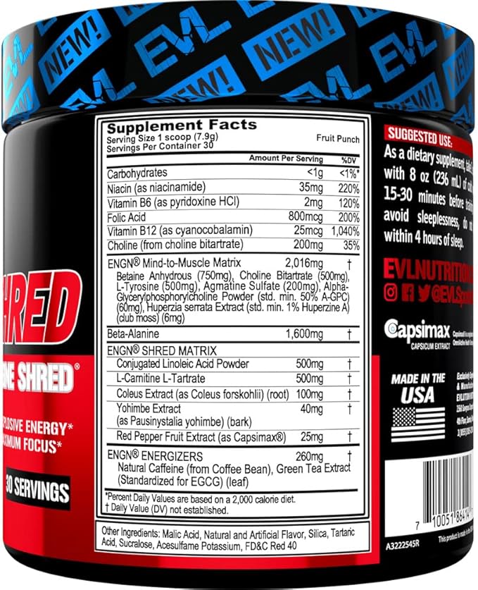 - Science Based Formula - Try the ENGN Shred pre-workout energy and focus supplement with exclusive ingredients including Beta alanine Agmatine Huperzine A L-Carnitine Yohimbe CLA and much more