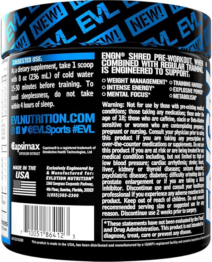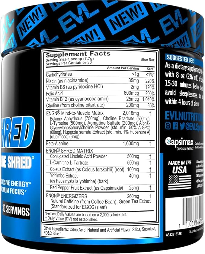 - Science Based Formula - Try the ENGN Shred pre-workout energy and fat burner support powder with exclusive ingredients including Beta alanine Agmatine Huperzine A L-Carnitine Yohimbe CLA and much more