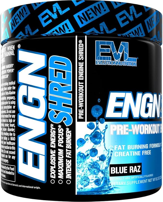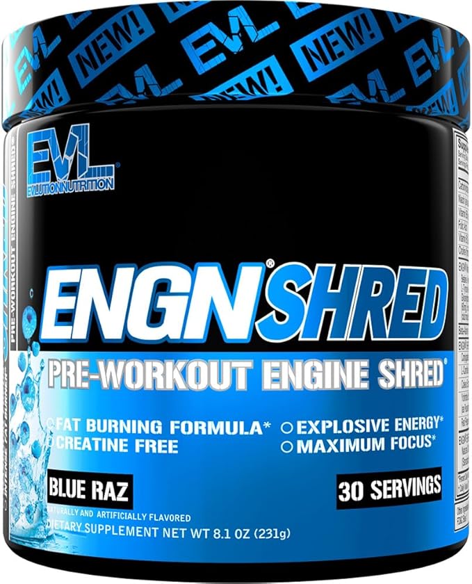 EVL Ultimate Pre Workout Powder - Thermogenic Fat Burn Support Preworkout Powder Drink for Lasting Energy Focus and Stamina - ENGN Shred Intense Creatine Free Preworkout Drink Mix - Blue Raz