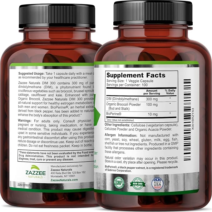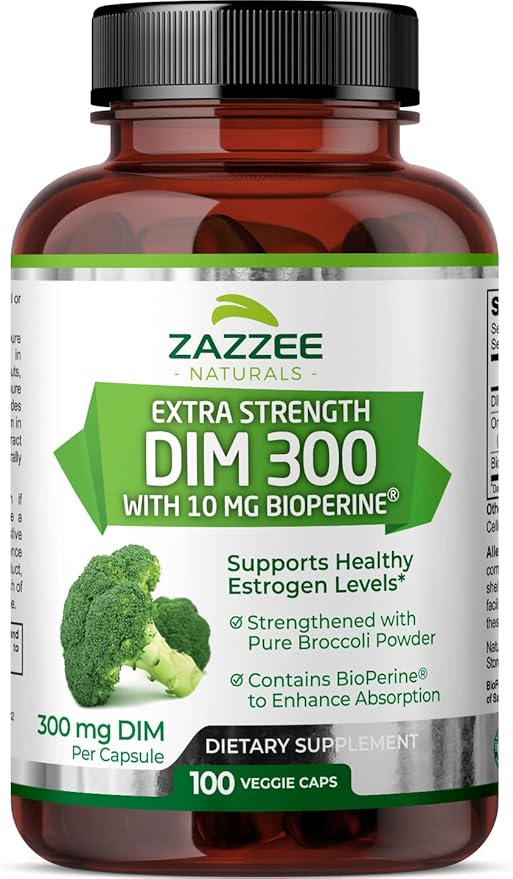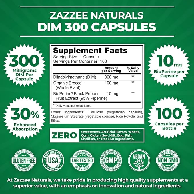 Zazzee Extra Strength DIM 300, 10 mg BioPerine and 300 mg DIM per Capsule, 100 Vegan Capsules, 3+ Month Supply, Plus Pure Organic Broccoli Extract, 100% Vegetarian, All-Natural and Non-GMO