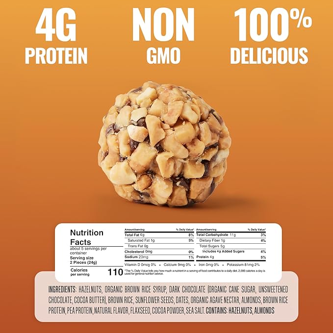 - RIDICULOUSLY TASTY CHOCOLATE HAZELNUT BITES: Crunchy and delicious, these protein power balls combine dry roasted hazelnut and decadent dark chocolate in irresistible snack size energy bites. Trust us, you’ll want 6 x 4oz bags for starters.