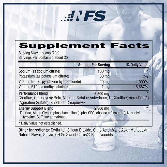 - SUPPORTS YOUR BODY'S ABILITY TO COPE WITH HIGH INTENSITY EXERCISE | This pre-workout has been tried and tested. With the ideal formula, this pre-workout contains the perfect combination of Taurine, Caffeine (200mg), Alpha GPC, L-Tyrosine, CARNOSYN BETA-ALANINE, and CREAPURE CREATINE MONOHYDRATE to keep your workout strong, meaningful, and successful. We manufacture all of our NF Sports Products in the USA, ensuring that each batch of supplements meets the highest purity and potency standards.