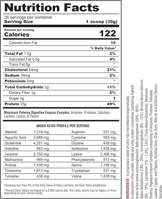 - 10x-microfiltered enzymatically whey protein isolate and whey protein concentrate which delivers 24g – 26g Protein, Very Low Sugar: 1g, Very Low Fat: 1.5g, Low Sodium, Low Cholesterol, and Low Calories: 122 calories per serving. Each serving also contains 5.6 grams of BCAA’s & 4.2 grams of L-Glutamine.