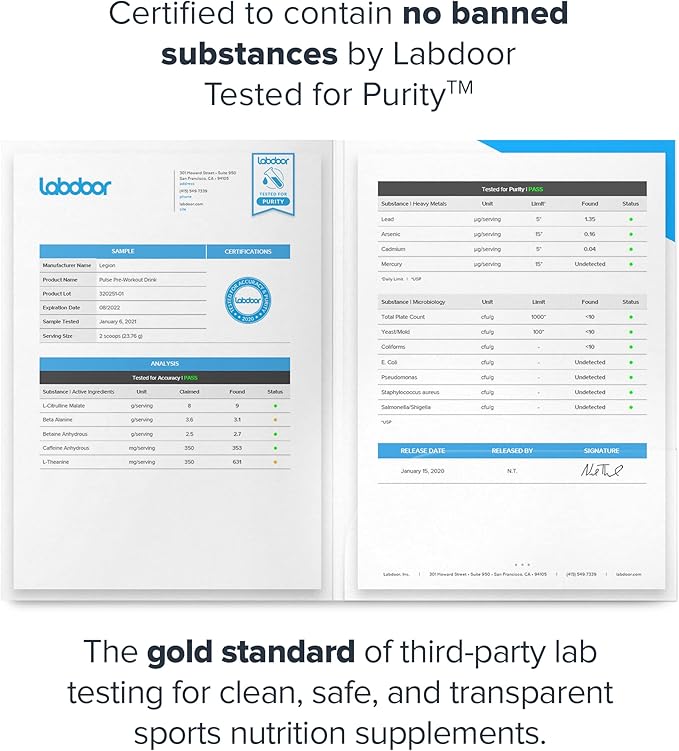 - Tested for purity and potency in an ISO 17025 accredited third-party lab, and independently certified to contain no contaminants or banned substances by Labdoor. Every bottle of our Pulse pre work out is guaranteed to provide exactly what the label claims and nothing else.