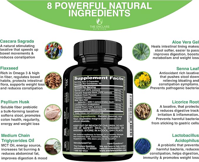 - ✅ ENJOY HEALTHY BOWEL MOVEMENTS WITH FAST ACTING 15 DAY COLON DETOX CLEANSE PRODUCT WITH NATURAL LAXATIVES FOR CONSTIPATION, PREBIOTICS, PROBIOTICS, FIBER, MCT OIL & ALOE VERA FOR A HAPPY GUT. Enclare 15 Day Colon Cleanse For Digestive Health Contain Natural Ingredients That Work Together To Flush Out Waste & Toxins, Improve Digestive Health & Nutrition Absorption, Increase Metabolism & Strengthen Colon Muscle. It Relieves Bloating And Improves Regularity, Boosts Energy, Focus, And Mood.*