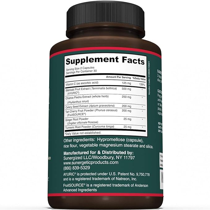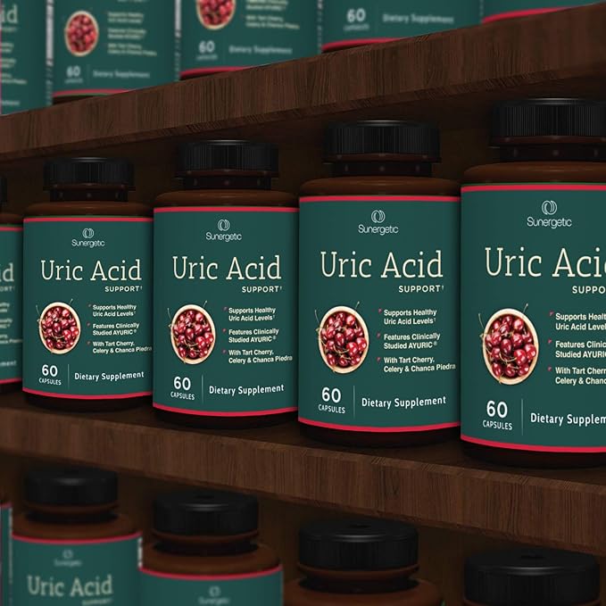 - POWERFUL URIC ACID SUPPORT: Our Uric Acid Support Supplement is formulated with ingredients to help support healthy uric acid levels, joint comfort and antioxidant properties. Our Uric Acid Support Supplement has a blend of herbs including clinically studied Ayuric, Tart Cherry, Celery Seed Extract, Turmeric, Chanca Piedra, Ginger and Vitamin C.