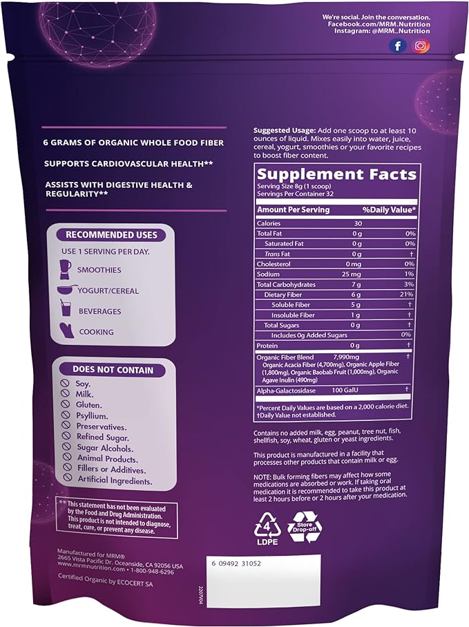 MRM Nutrition Whole Food Organic Fiber | with Enzymes + Prebiotics | Insoluble + Soluble fibers | Digestive Health + Regularity | 6g Fiber per Serving | 32 Servings