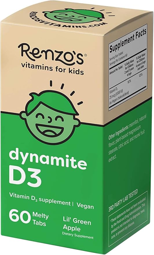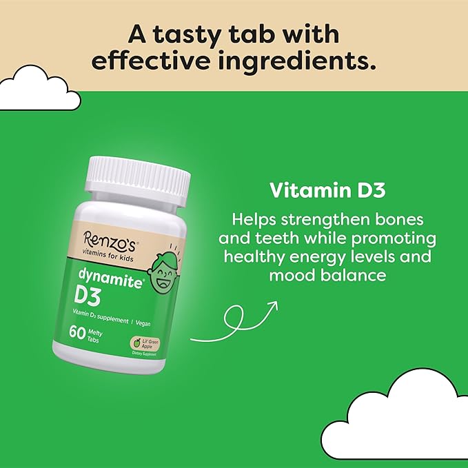 Renzo's Dynamite Vitamin D3 - Dissolving Kids Vitamin D3-60 Sugar-Free Melty Tabs, Lil’ Green Apple Flavored