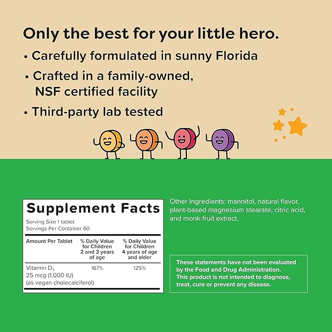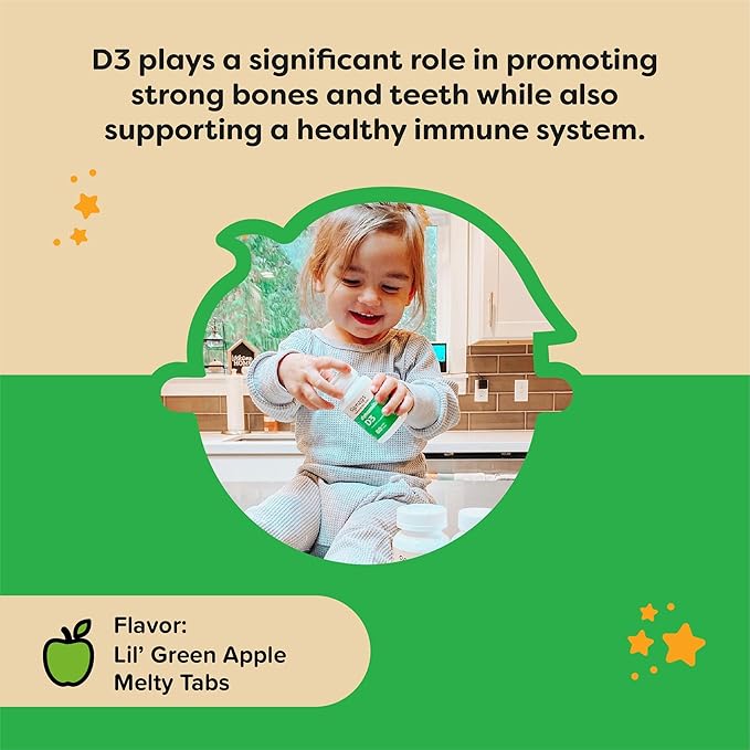 - Made with kid-approved flavors & clean ingredients: Dynamite D3 melty tabs come in a yummy lil’ green apple flavor; our formula is vegan, non-GMO, sugar-free, gluten-free, free of the 8 common allergens, and without any yucky artificial colors or flavors