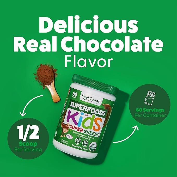 Feel Great USDA Organic Super Greens for Kids | Vegan Chocolate Greens Powder with Veggie Powder for Kids | Superfood Powder with Probiotics & Digestive Enzymes for Digestive Health | 2 Month Supply