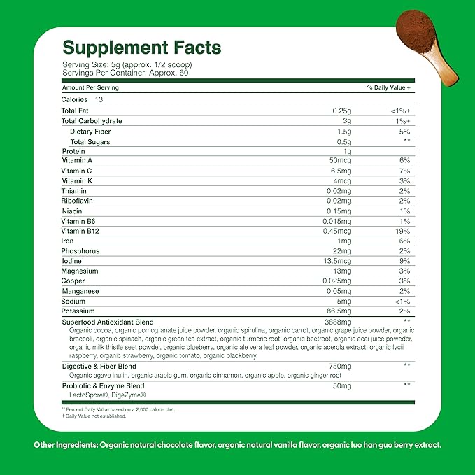 - DELICIOUS GREENS – Say goodbye to battles over fruits & veggies and hello to chocolatey goodness! Our picky-eater approved greens drink mixes magically into smoothies or juice, no pills required.