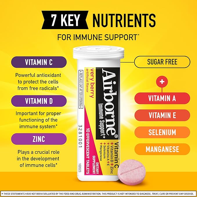 - VITAMIN C 1000mg: Airborne immune support effervescent tablets are packed with 1000mg Vitamin C per serving, which helps support your immune system.