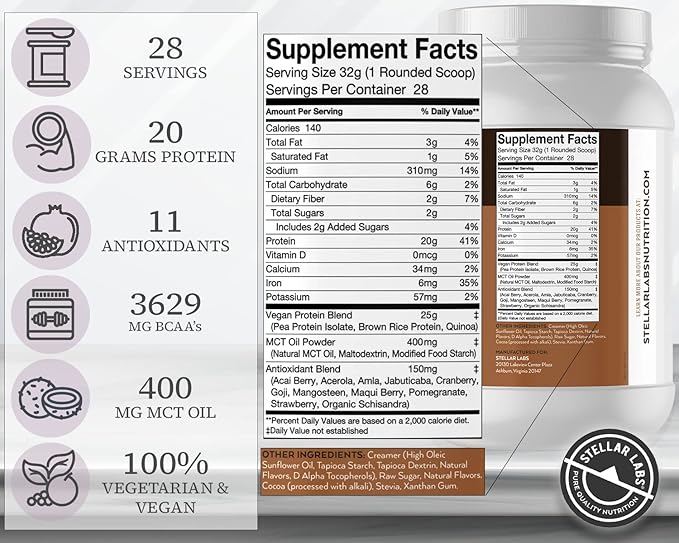 - FINALLY A HEALTHY PROTEIN POWDER THAT TASTES DELICIOUS: Yes, finally! Stellar Labs Vegan protein powder was specially formulated and developed by Licensed Nutritionists, Dieticians, and Personal Trainers. It combines powerful plant-based proteins, BCAA's, antioxidants and MCT oil, plus it's low FODMAP and tastes delicious on it's own or as an ingredient!