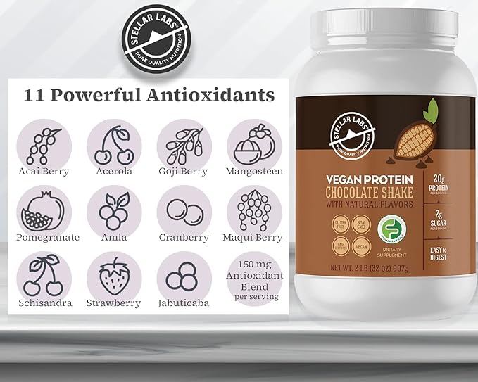Stellar Labs Vegan Protein Powder with BCAA's & Antioxidants | Certified Low FODMAP, Non GMO, Gluten Free, Soy Free, Low Carb, with Stevia | Lean Plant Based Protein Powder Shakes | Chocolate