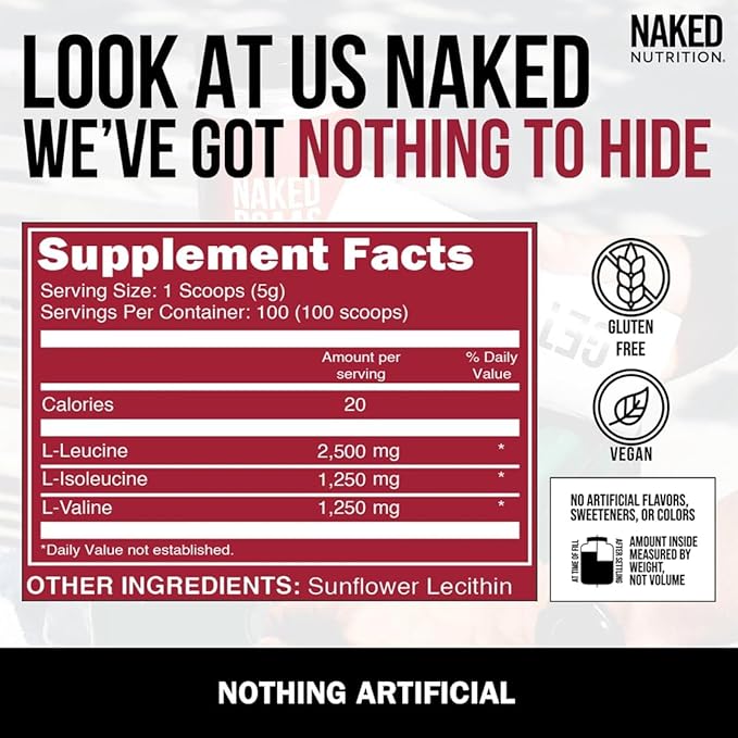Naked BCAAs Amino Acids Powder, Only 1 Ingredient, Pure 2:1:1 Formula, Vegan Unflavored Branched Chain Amino Acids, Instantized All Natural BCAA Supplement - 500 Grams, 100 Servings