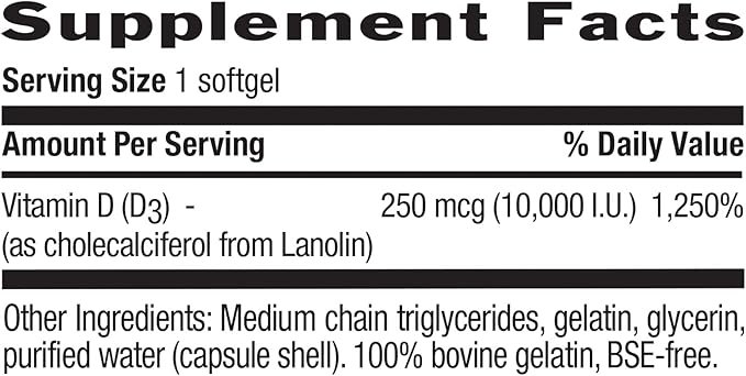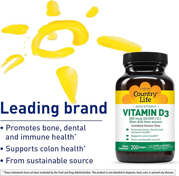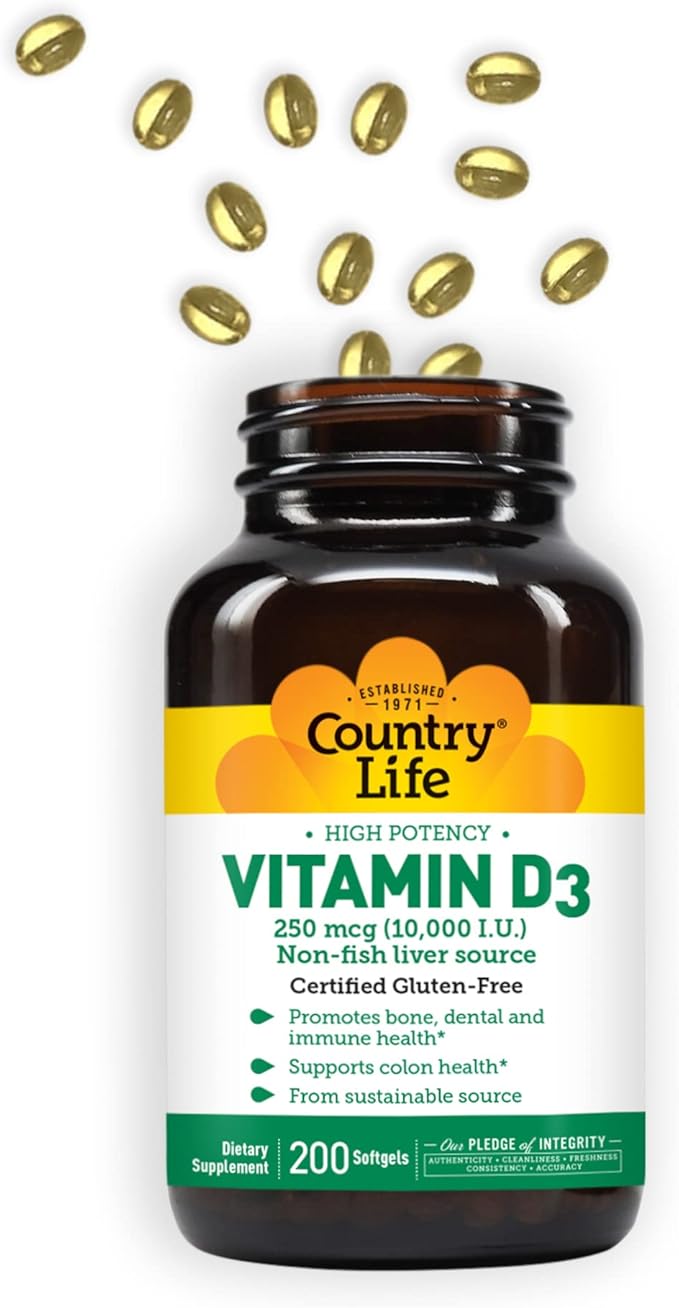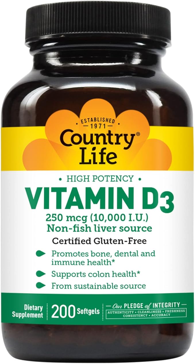 Country Life Vitamin D3, High Potency, Non-Fish, 10,000 IU, 200 Softgels, Certified Gluten Free