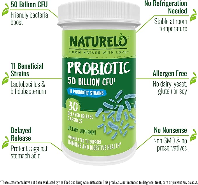 NATURELO Probiotics for Digestive Health - 50 Billion CFU, 11 Strains Daily Supplement - Boosts Immune System, Delayed Release, 30 Vegetarian Capsules