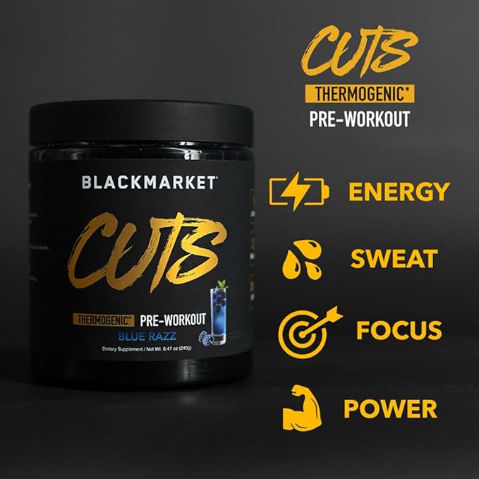 BLACKMARKET CUTS Pre Workout - Flavored Energy Powdered Drink Mix for Men & Women, Great for Muscle Definition, Thermogenic, Creatine Free, (Blue Razz, 30 Servings)